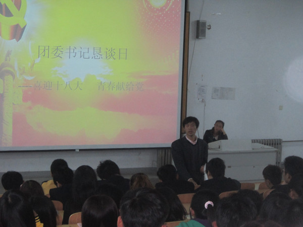 为迎接党的十八大的胜利召开,10月22日,外国语学院基层团委在阶梯教室举行了“喜迎十八大,青春献给党”书记恳谈活动。外国语学院基层团委书记祝景朋参与并主持了此次活动,参与此次恳谈活动还有外国语学院基层团委、学生会全体成员及各团支部委员。