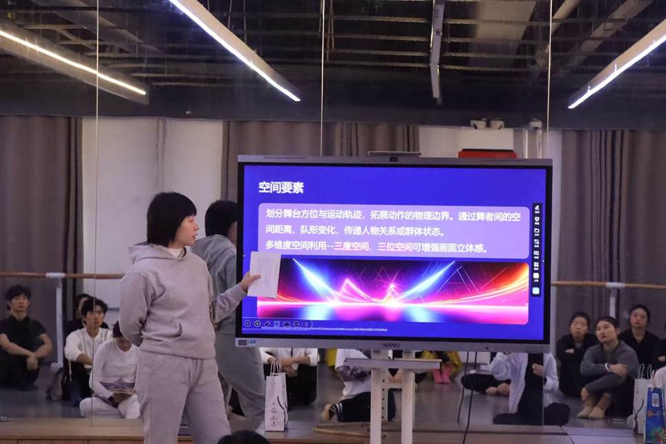 讲座中,张骄副教授围绕舞蹈创作的三大核心要素展开系统讲解。在时间要素维度,她从节奏把控、动作时长设计、情节推进节奏等方面,解析了时间编排对舞蹈叙事张力的影响;针对空间要素,结合舞台调度、队形变化、多维度空间构建等关键内容,阐述了如何通过空间布局强化舞蹈的视觉表达与情感传递;在力量要素部分,她聚焦动作力度控制、发力方式变化、力量与情感的关联,揭示了力量运用对舞蹈质感与艺术感染力的决定性作用。