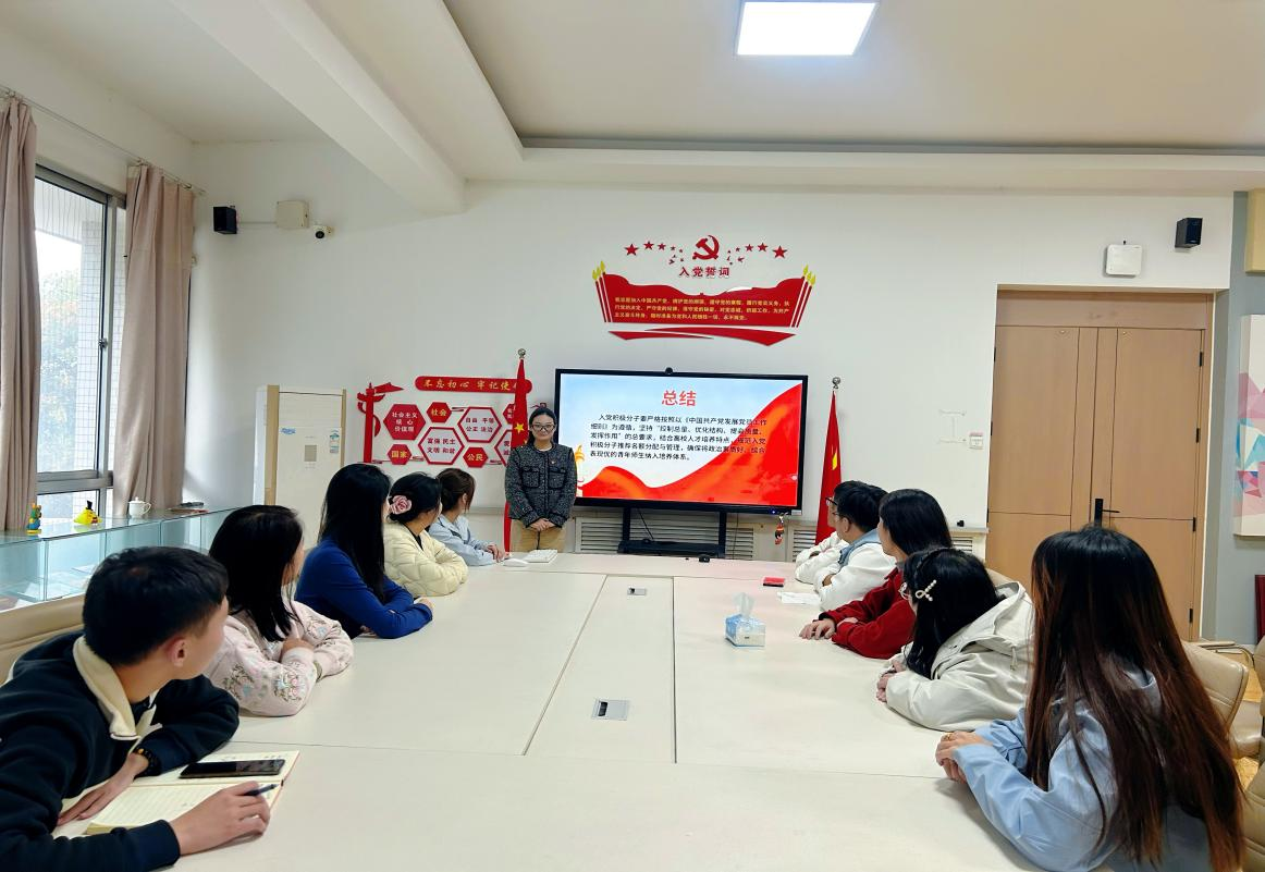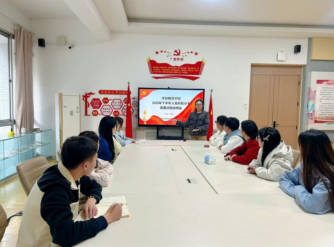为深入贯彻习近平新时代中国特色社会主义思想,严格落实《中国共产党发展党员工作细则》,进一步规范入党积极分子的培养、教育与考察工作,提升党员发展工作质量,10月28日,学前教育学院党总支在学前楼一楼党员活动室,组织召开了2025年下半年入党积极分子发展工作专题培训,学前教育学院党总支书记王琪瑶、组织员李明哲、各支部委员和全体党员参加。