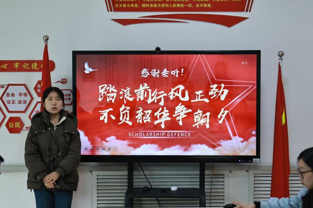 在答辩会上,9位候选人以PPT汇报为载体,围绕“思想铸魂、学业深耕、专业实践、志愿服务”四大维度展开精彩展示。答辩过程中,评委老师们针对性地进行提问,深入了解候选人专业学习和学科竞赛等方面的情况,并提出建设性意见。