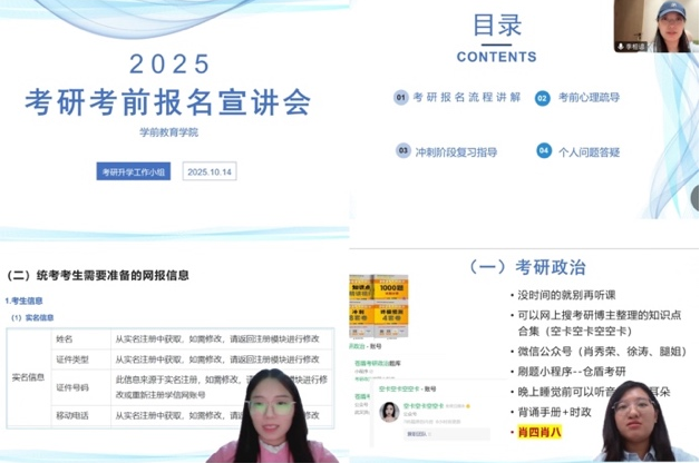 为帮助学生更好地备战全国硕士研究生统一招生考试,我校学前教育学院于10月14日组织了一场线上考研宣讲会。本次活动主要面向学院内即将参加研究生考试的学子,旨在通过专业指导与暖心关怀,为正处于备考冲刺阶段的学生答疑解惑、增强信心。宣讲会通过线上会议平台开展,吸引了众多有志于继续深造的同学积极参与。