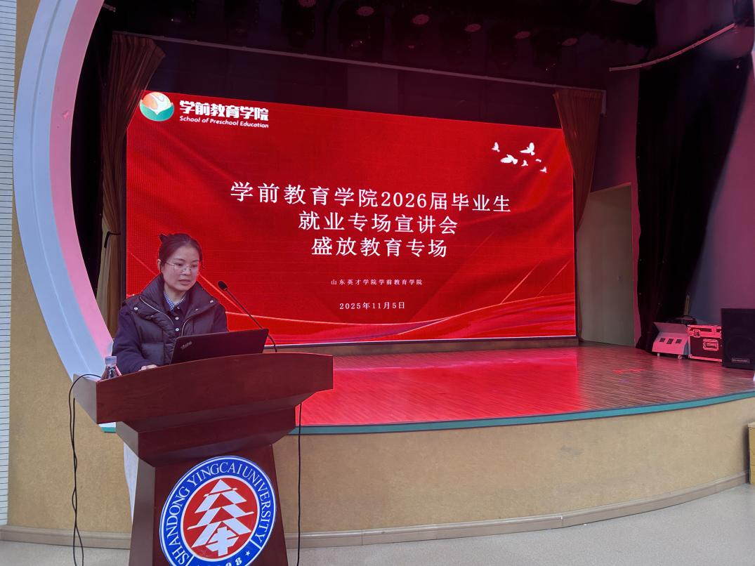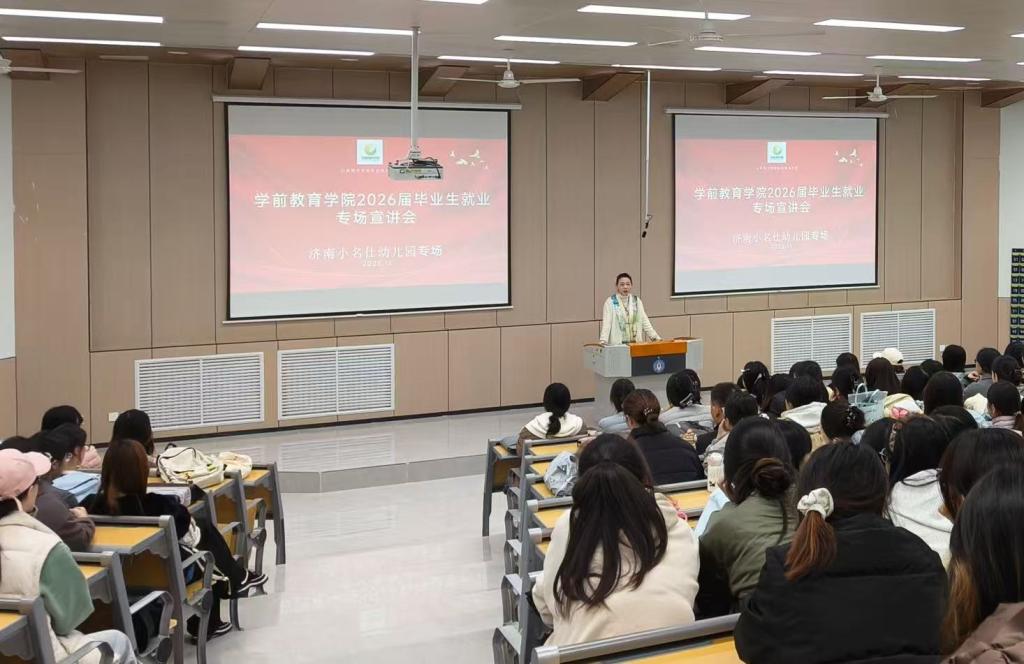 为落实学校 “就业优先” 战略部署,深化学前教育专业 “校企协同育人” 模式,11月4日至6日,学前教育学院连续举办3场2026届毕业生就业专场宣讲会。BC国际婴幼园、济南小名仕幼儿园、盛放教育等优质幼教机构受邀到场,通过“政策解读+岗位推介+互动答疑”形式,为毕业生送上“就业指南”。