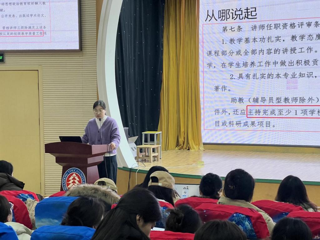 12月23日下午2点,学前教育学院小剧场内座无虚席,一场以“课程建设与教学质量提升”为主题的青年教师培训在此成功举办。本次培训由学院专业负责人程香晖老师主讲,旨在提升青年教师的课程建设能力,促进教学质量的全面提升。学院全体青训教师及其他教师代表积极参与,共同探索教学新路径。