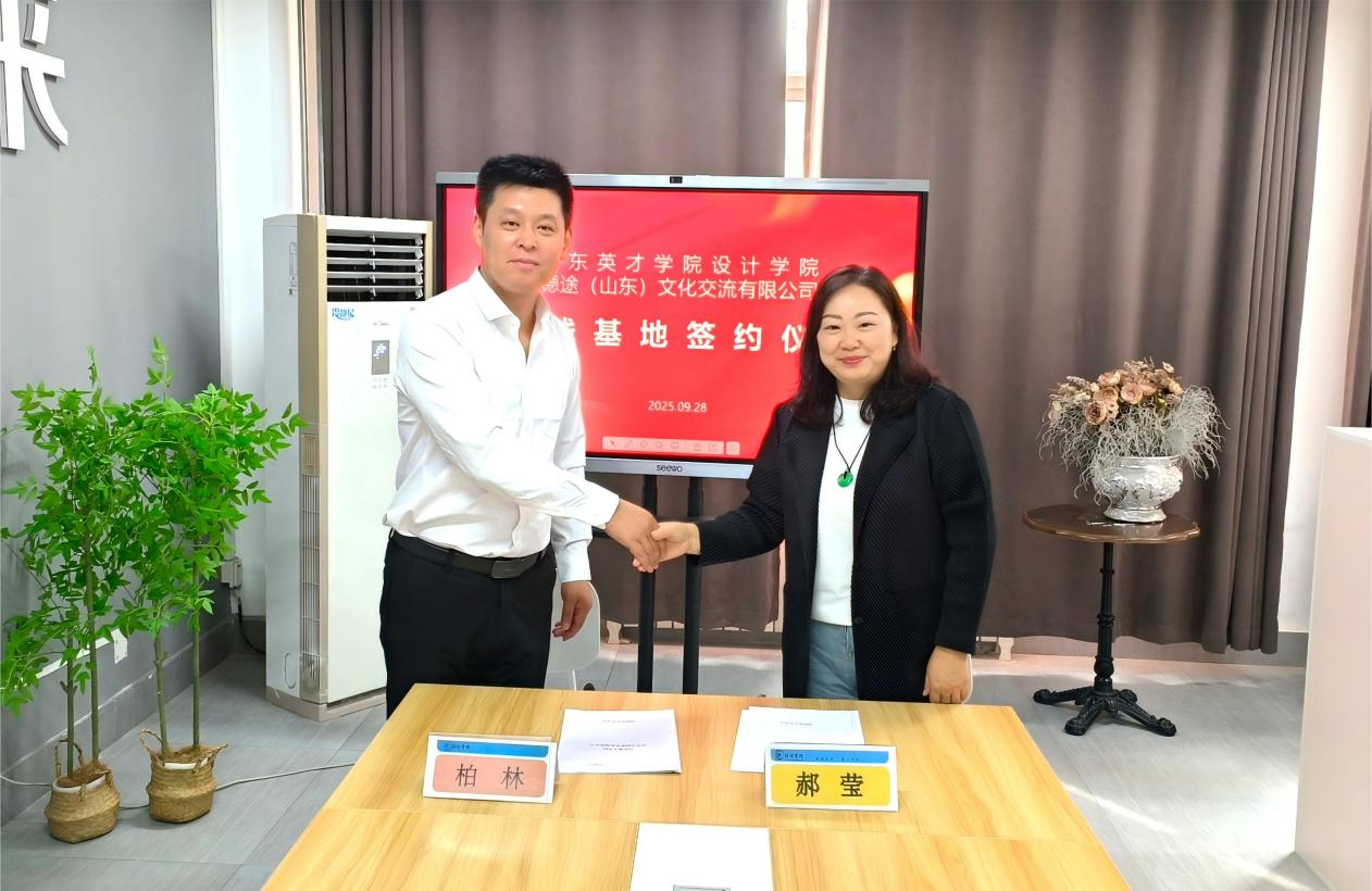 9月29日,德途(山东)文化交流有限公司总经理柏林、总监郭璟一行到访山东英才学院设计学院,双方共同举行校企实践基地签约仪式。设计学院院长郝莹、副院长尚宪福及视传数媒系主任李俊峰热情接待并陪同参观交流。