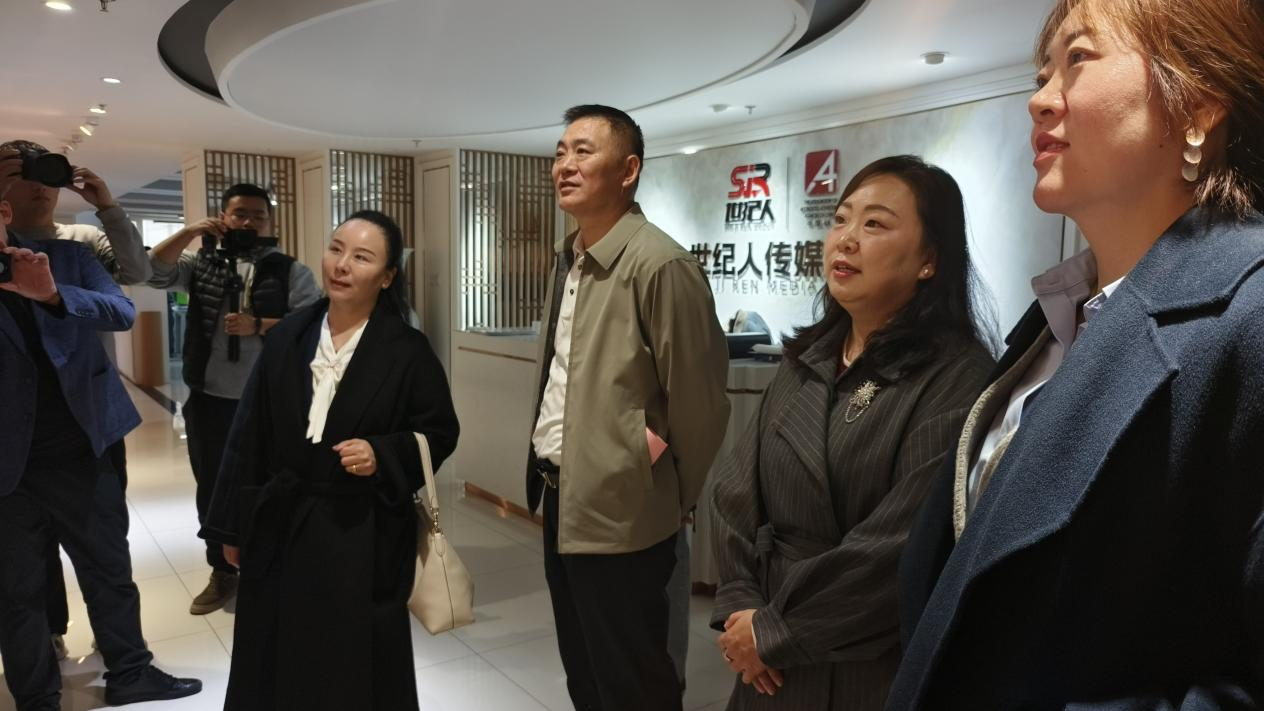 在周政董事长的陪同下,走访团队先后参观了集团数字化营销中心、内容创作工坊及成果展示区,实地了解企业运营生态与创新成果。作为拥有上百人员工、在全国八座城市设有办事处的行业标杆企业,世纪人传媒的业务版图涵盖品牌策划、数字营销、新媒体运营等核心领域,服务于中国移动、三星、海信医疗等众多知名品牌。展示区中,从为山东电信打造的两小时131 万观看量直播案例,到 “赫姿” 系列国货品牌的数字化赋能成果,全方位呈现了企业在数字营销与内容创新领域的硬实力。尤其在虚拟形象设计、短视频创意制作等板块,与英才学院设计学科的专业方向高度契合,为双方合作埋下伏笔。