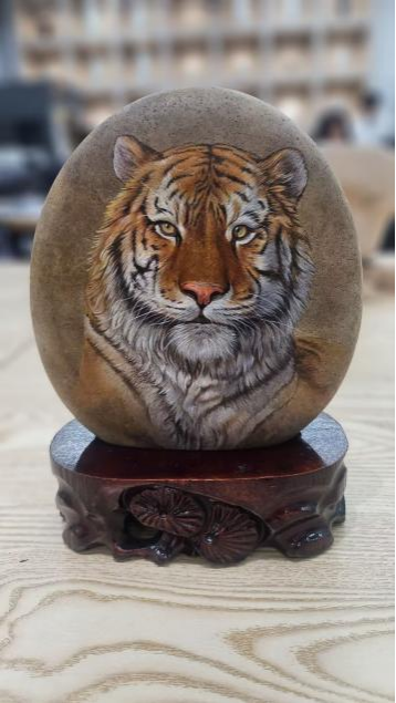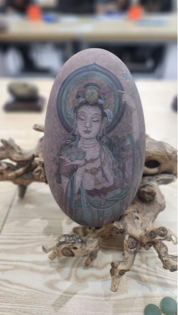 作品展示区前,师生驻足观赏、踊跃提问。孟繁华老师现场解读作品背后的创作灵感,细致演示“读石”过程——如何循石之天然形态、纹理肌理构思画面,让顽石与艺术构思精妙融合,呈现“石中有画、画中见石”的独特境界,令在场师生深受启迪。