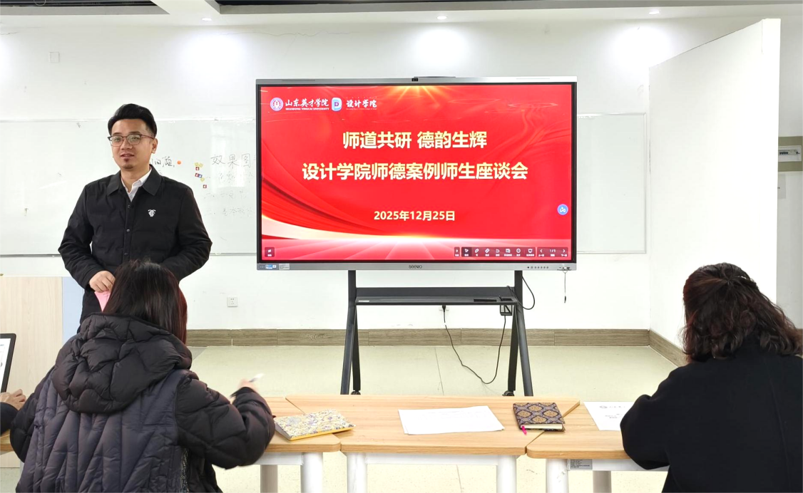 为切实将立德树人根本任务贯穿教师队伍建设全过程,强化教师师德自觉,搭建师生交流平台,形成师德建设长效成果,设计学院于2025年12月25日开展“师道共研,德韵生辉”师生座谈会。设计学院副院长尚宪福、骨干教师及学生代表踊跃参与。