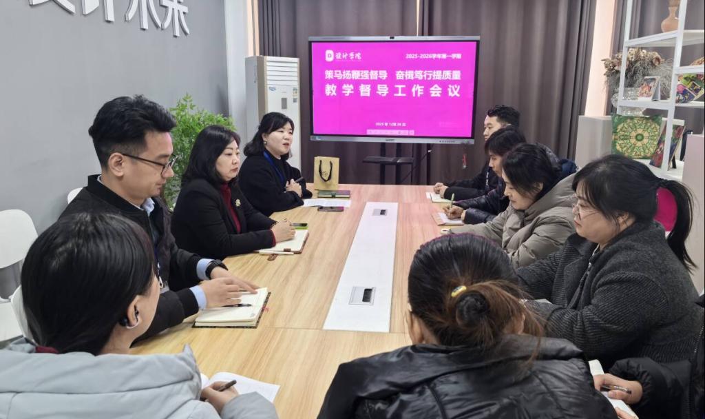 为全面总结本学期教学督导工作,精准梳理教学过程中的亮点与不足,持续提升教育教学质量,2025年12月26日,设计学院以“策马扬鞭强督导 奋楫笃行提质量”为主题,召开学期末教学督导会议,全面总结本学期督导工作、梳理教学亮点与不足。学院院长郝莹、副院长尚宪福及全体教学督导员参会,会议由督导组长李俊峰主持。