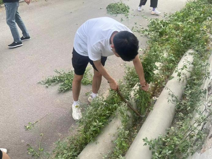 实践团成员在清洁道路杂草