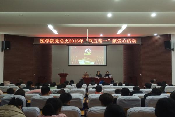为积极响应学校党委的号召,继续深入开展“联五帮一献爱心”活动,展现党组织优良作风,体现党组织对学生的关心、支持与厚爱,切实发挥好党员的先进性和模范性,2017年1月6日中午12:15,医学院党总支在学术报告厅举行“联五帮一献爱心”活动总结大会。医学院党总支书记郭传祯主持,出席会议的领导有校长办公室韩帮峰副主任,医学院党总支、党群校务部党支部的全体党员与受资助学生。