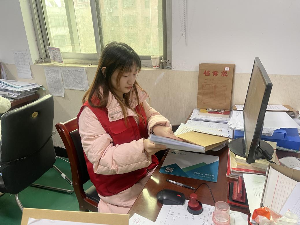 图为“天使之翼”社会实践团成员装订档案