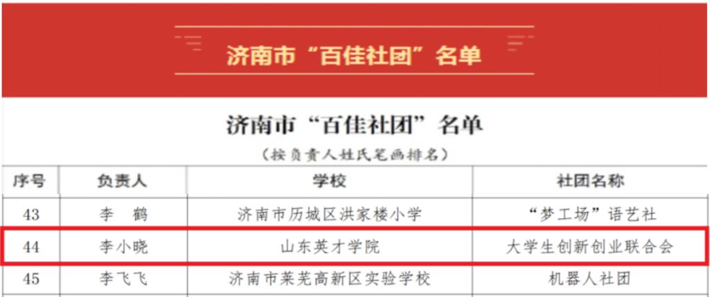 近日,济南市教育局公布2025年济南市“百佳社团”名单,山东英才学院大学生创新创业联合会凭借特色鲜明的品牌活动与扎实丰硕的育人成效从众多参选社团中脱颖而出,成功入选。
