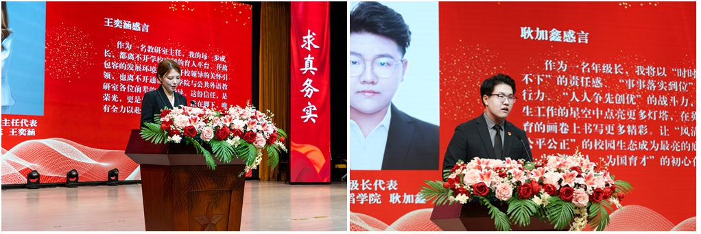 随后,新任系(教研室)主任代表王奕涵、年级长代表耿加鑫分别作表态发言。他们立足岗位职责,围绕落实立德树人根本任务,从推进教学科研创新、加强团队建设、提升学生服务质量等方面郑重承诺,表达了不负重托、勇担使命的坚定决心。