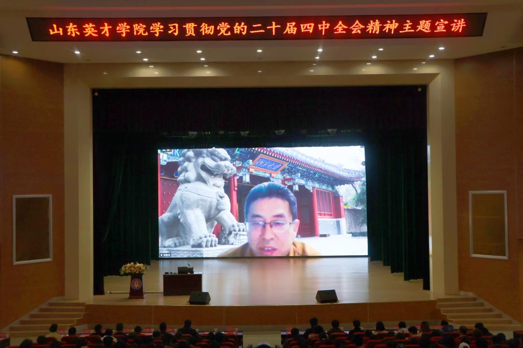 11月21日,马研会理事、博士生宣讲团副团长喻伟率宣讲调研团一行到校,开展学习贯彻党的二十届四中全会精神主题宣讲活动。山东英才学院党委副书记、执行校长王晓娜,党委副书记、工会主席孙玉香对宣讲团成员的到来表示热烈欢迎,并全程参与活动。宣讲会设于大学生活动中心,由孙玉香副书记主持,马克思主义学院、商学院等师生代表约800人参加。
