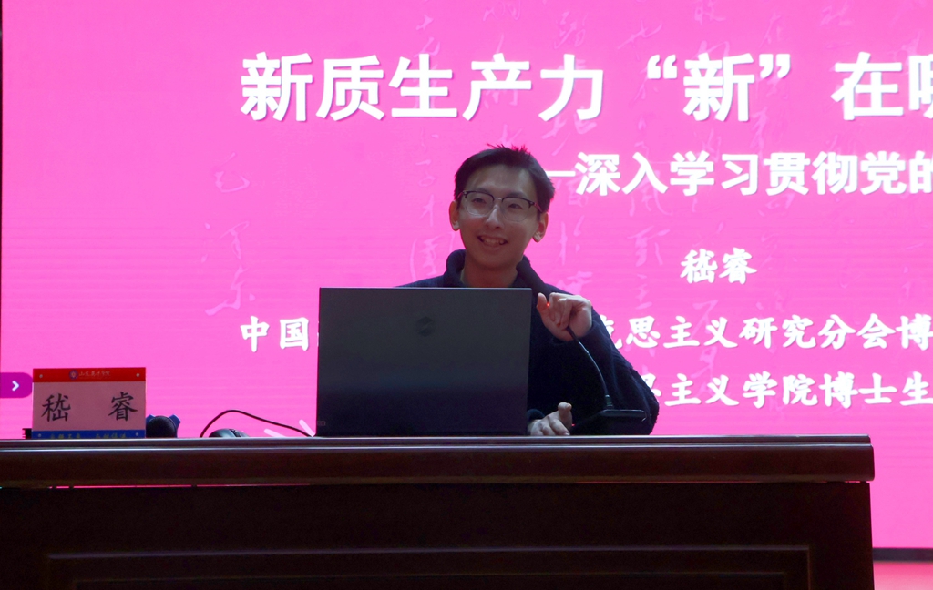 马研会宣讲团成员、中国人民大学马克思主义学院嵇睿博士聚焦“新质生产力”主题,从发展背景、表现形式与理论内涵等方面展开全面解读,结合科技创新与人才培养前沿动态,分析了新质生产力对高等教育改革的引领作用,为学校学科建设与人才培养拓宽了思路。