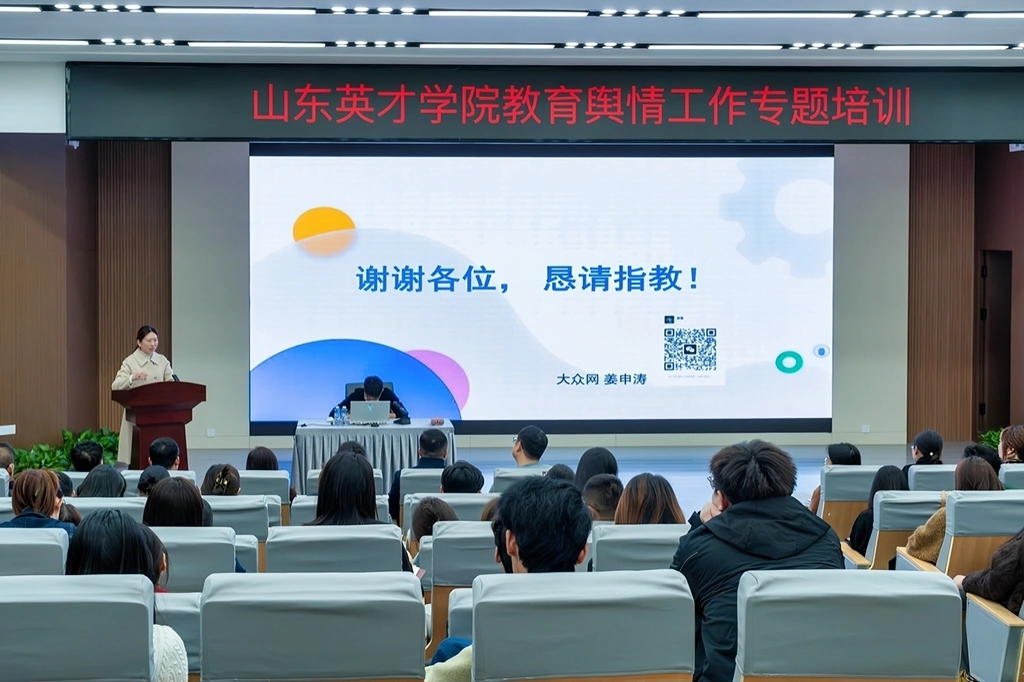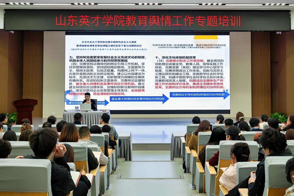 为全面提升新形势下教育舆情的应对与处置能力,11月26日,学校在南校区知行楼报告厅成功举办“全媒体时代教育舆情研判与处置”专题培训。山东省网络安全工程师、知名高校舆情专家姜申涛应邀作专题报告。学校各职能部门负责人、二级学院党组织负责人、宣传员、教师网评员及辅导员代表参加培训。党委宣传部部长王坤丽主持培训会。