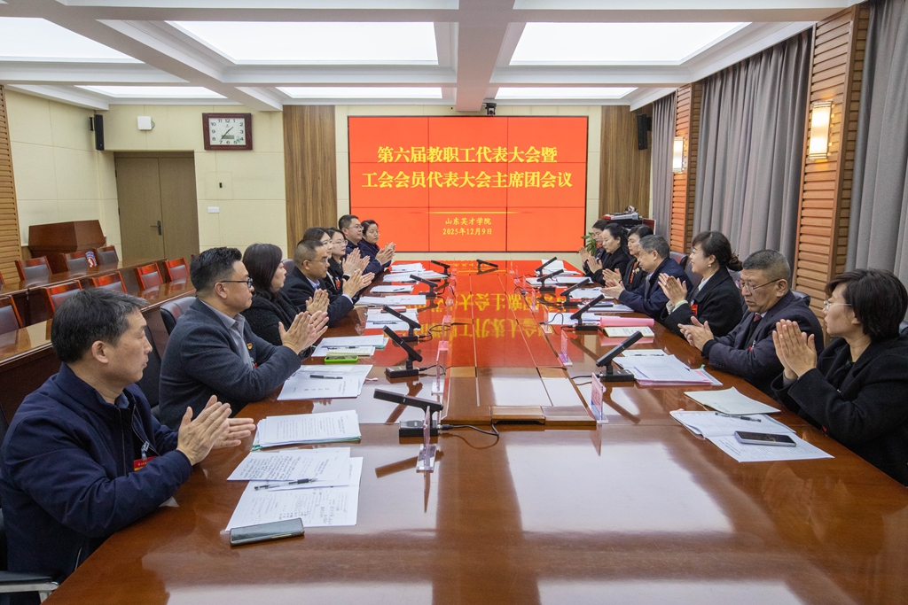 2025年12月9日,山东英才学院第六届教职工代表大会暨工会会员代表大会在南校区学术报告厅隆重举行。山东省教育工会委员会二级调研员王辉,济南市教育工会主席任树军,济南高新区管委会主任助理、高新区总工会主席宋丰华出席开幕式并致辞。学校顾问校长张星臣,党委副书记、执行校长王晓娜,党委副书记、工会主席孙玉香,副校长崔奎勇,纪委书记、副校长李晓玲,副校长孙文红,校长助理张瑞君,正式代表、列席代表等170多人出席会议。