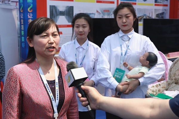 在展览现场,来自英才学院展区的realcare baby智能仿真娃娃发出的一阵阵哭声、笑声,成为大众关注和媒体采访的“焦点”。来自学前教育专业的同学们现场演示了智能娃娃的养护与照料过程,展现出该校学前教育专业的办学特色优势和具有开创性、引领性的教学模式、方法、设备。