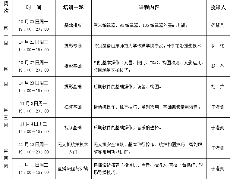 整合校内宣传资源,系统提升参训人员的新闻采写、摄影摄像、新媒体运营等专业技能,构建一支政治坚定、业务精湛、反应迅速的宣传工作骨干队伍。同时,为广大师生提供学习与实践平台,共同讲好校园故事,传播校园正能量。