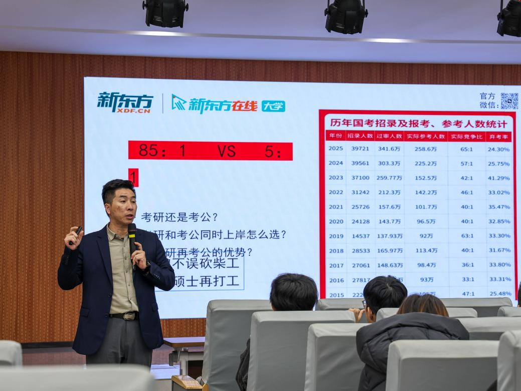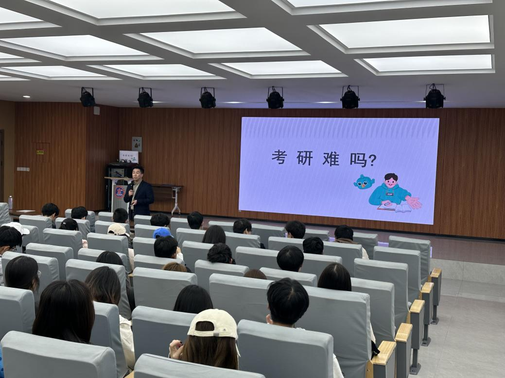 首场活动于11月6日举行,主题为“新起点,新篇章”,重点关注考研规划。学院特邀新东方专升本资深职业规划师进行分享。讲座以“考研难吗?”这一互动问题开场,迅速引发学生共鸣,现场气氛热烈。讲师通过对比历年招录数据,深入剖析考研与考公的竞争态势,并围绕学业与实习的平衡、院校与专业选择等常见问题,提出科学实用的建议,助力学生构建清晰的备考路径。
