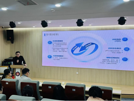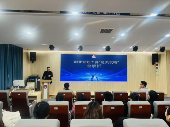 为有效提升就业创业教师队伍的指导能力,助力教师精准把握职业规划教学要点,进一步增强对学生指导的专业性和实效性,12月16日下午,通识教育学院于英才讲堂组织开展了就业创业指导能力提升专题培训。本次培训特邀山东工艺美术学院创新创业学院党总支副书记、副教授解恒岩担任主讲,围绕《职业规划大赛通关攻略全解析》主题展开深入的教学研讨与经验分享。通识教育学院人文素养与职业发展教研室主任赵霞、招生就业处副处长尹逊坤,以及全体承担就业创业相关课程的教师参加了培训,部分职业规划大赛参赛学生也到场聆听。