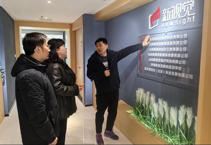 2025年2月11日,山东英才学院设计学院时尚数媒系主任李俊峰一行前往山东新视觉数码科技有限公司考察参观,聚焦人工智能3.0时代下产教融合、校企协同育人新模式,为学院专业建设与产业学院发展拓宽路径。新视觉数码经理李华宇陪同参观,公司董事长王铁兵、总经理张鲁浙出席座谈并深入交流。
