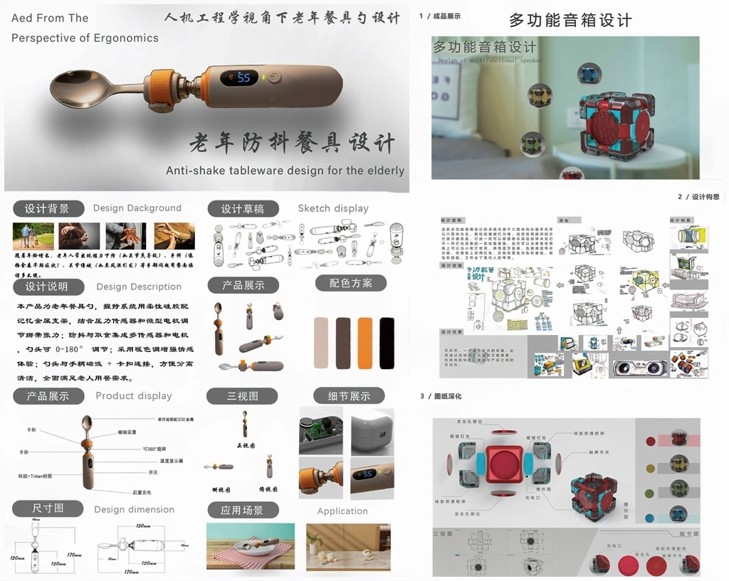 此外,多个作品在不同设计领域崭露头角。视觉传达设计专业的《年画新韵appUI交互界面设计》荣获二等奖,作品以时尚化的设计语言活化传统年画,探索了非遗文化的数字化传播新路径。产品设计专业的《多功能音箱设计》、《老年防抖餐具设计》等获奖作品,则体现了学子们对社会需求与人文关怀的敏锐洞察。