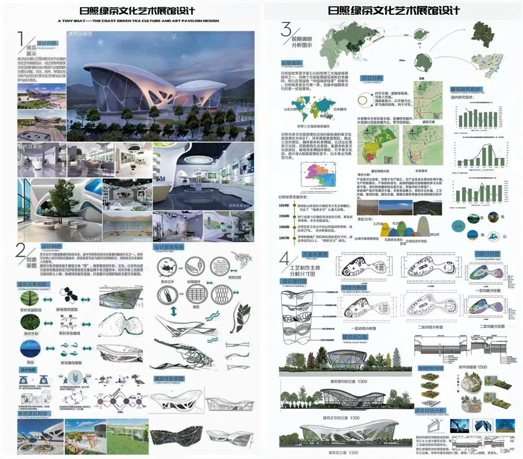 其中,环境设计专业作品《日照茶文化艺术展馆设计》荣获一等奖。该作品以“日照绿茶”文化为核心,巧妙提取“一叶扁舟”及海浪元素,将传统茶文化与现代展馆空间相融合,其独特的设计构思与深厚的文化内涵,赢得了评审专家的一致好评,被誉为“地域文化展馆设计的优秀范例”。