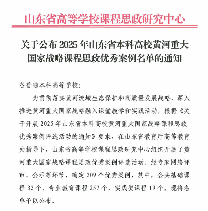 近日,山东省高等学校课程思政研究中心公布了2025年山东省本科高校黄河重...