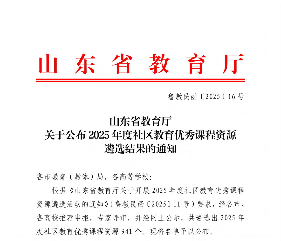 近日,山东省教育厅公布了2025年度社区教育优秀课程资源及2025年度山东省...