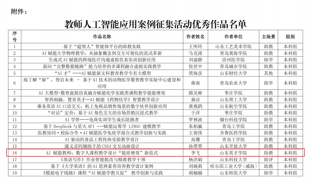 近日,山东省电化教育馆公布教师人工智能应用案例征集活动优秀作品名单,我校工学院李飞老师凭借作品《AI赋能教师:数字人课程教学设计“提质增效”新范式》脱颖而出,荣获本科组奖项。