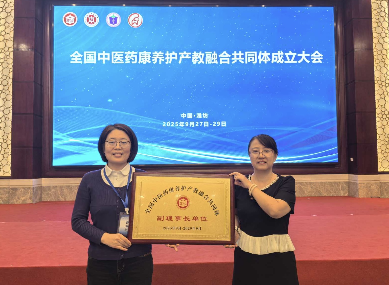 金秋送爽,喜讯传来。在2025年9月27日至29日于山东潍坊召开的“中国医护整合联盟2025年学术年会暨全国中医药康养护产教融合共同体成立大会”上,山东英才学院被正式授予“全国中医药康养护产教融合共同体副理事长单位”。这一荣誉是业界对我校在医养健康领域办学实力与产教融合成果的高度认可,标志着我校在中医药康养护领域的发展迈入新阶段,影响力再攀新高度。