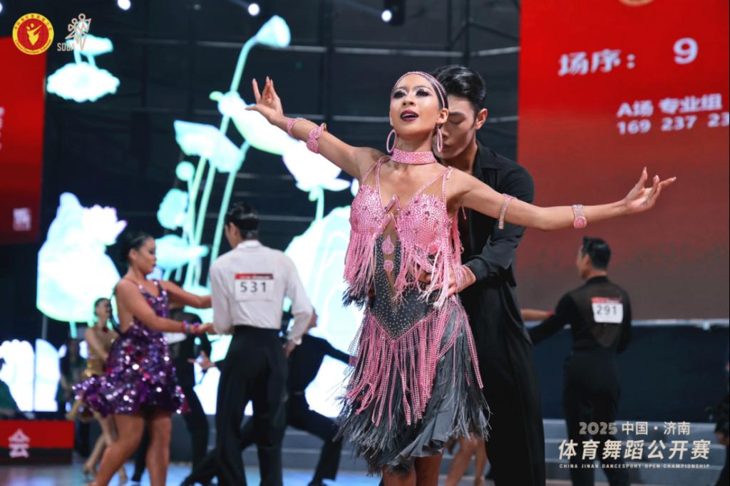 近日,2025中国·济南体育舞蹈公开赛暨山东省第32届体育舞蹈锦标赛在济南市大学里体育中心隆重举行。山东英才学院选派60余名学子参赛,凭借过硬的专业素养与出色的临场发挥,共斩获60余项大奖,其中包括8枚金牌、9枚银牌和5枚铜牌,以亮眼成绩展现了学院在体育舞蹈人才培养上的显著成效。本届赛事作为省内体育舞蹈领域的高水平竞技舞台,由山东省体育舞蹈运动协会主办,吸引了来自全省各地的千余名精英舞者同台竞技,竞争激烈。