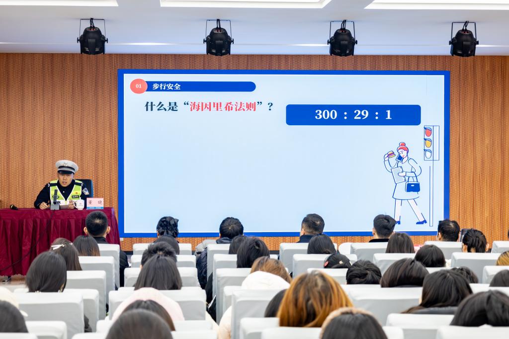 12月2日,正值第十四个“全国交通安全日”,为全面提升师生交通安全意识、法治意识与文明意识,从源头上预防道路交通事故,营造安全、畅通、文明、和谐的道路交通环境,北校区综合办公室特邀起步区交警大队大桥中队民警走进校园,举办主题宣传教育讲座。活动于当日下午在北校区明德楼300报告厅举行,安保干部、辅导员及学生代表共计220余人参与。