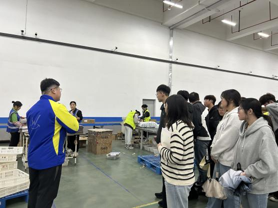 在企业负责人接待下,师生首站参观一楼仓库。负责人系统讲解物品出入库全流程,从订单接收、货物验收、分类存储到拣选出库等环节逐一说明,并介绍了叉车、传送带等装卸搬运设备的操作应用,学生认真记录并积极提问。