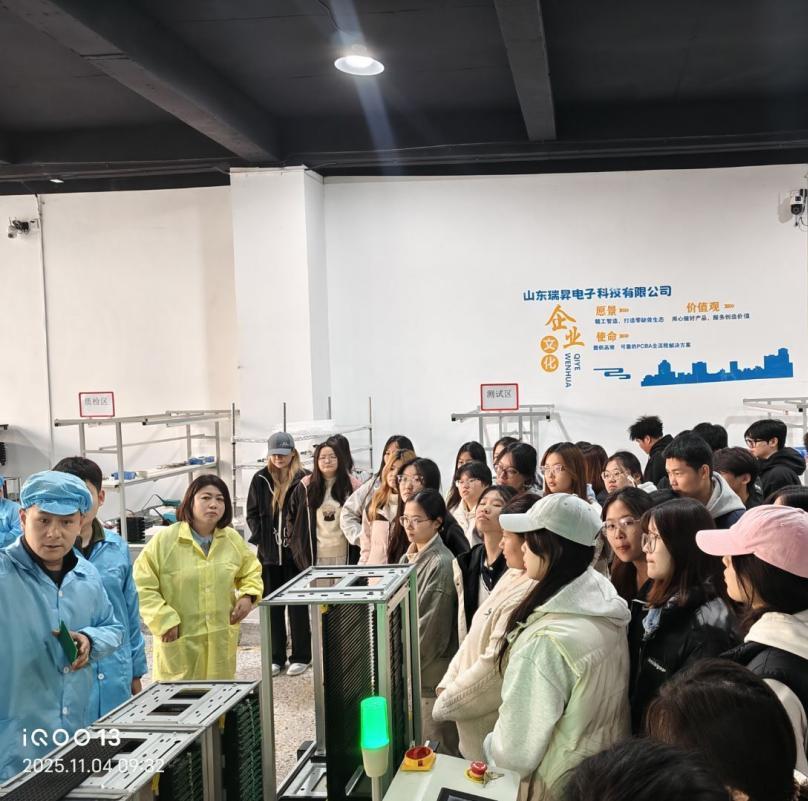 随后,师生一行依次参观了集团旗下的济南多瑞电子商务公司、山东弗斯特智能科技有限公司及济南凯夫环保有限公司。在弗斯特智能科技与凯夫环保的精密仪器加工车间、SMT(表面贴装技术)车间以及综合实验测试室中,学生们近距离观摩了高精度设备的生产流程与质检环节,切身感受到智能制造与精益管理的落地实践。