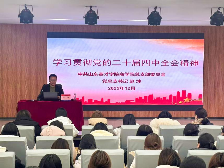 为深入学习贯彻党的二十届四中全会精神,12月24日,山东英才学院商学院(国际学院)召开学习贯彻党的二十届四中全会精神宣讲会。商学院(国际学院)党总支书记赵坤作专题报告。