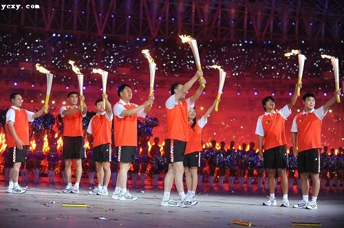 10月16日晚,第十一届全国运动会开幕式在济南举行。这是火炬手在开幕式上传递火炬。