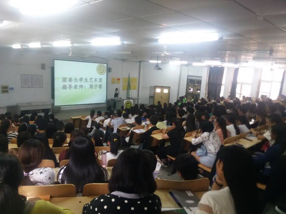为了让2015级大学生艺术团新成员们一个认识与交流的机会,特此大学生艺术团于2015年9月8日中午12时在阶梯教室举办了“山东英才学院大学生艺术团15级新生见面会”,出席本次活动的有团委指导老师周子馨及各部门负责人。