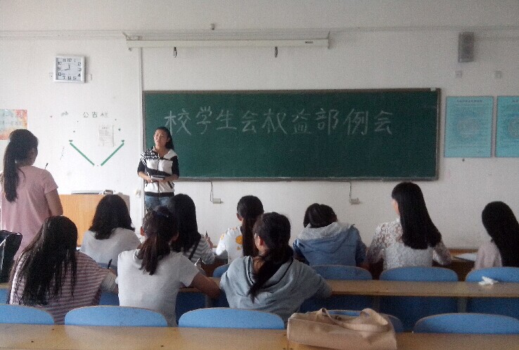 为了布置和总结近期工作,校学生会权益部于2014年9月24日在综教楼南楼5007教室召开了“校学生会权益部例会”。参加本次例会的有权益部13级优秀干事刘斐、王倩琳以及权益部14级全体干事。本次例会由刘斐主持。