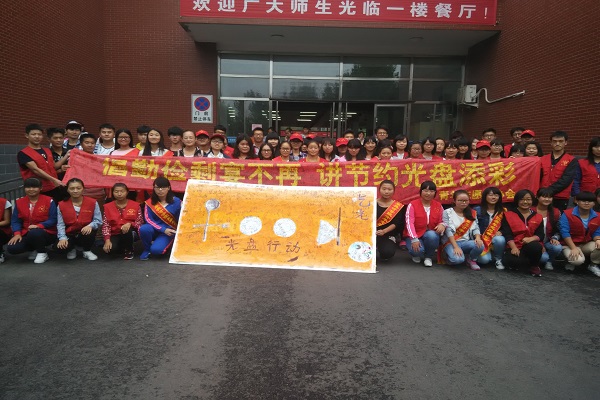 为了响应团委勤俭节约的号召,为了让广大师生厉行节约杜绝浪费,9月11日中午,北校区青年志愿者协会携手广播电台在餐厅北门举行了“光盘行动”。
