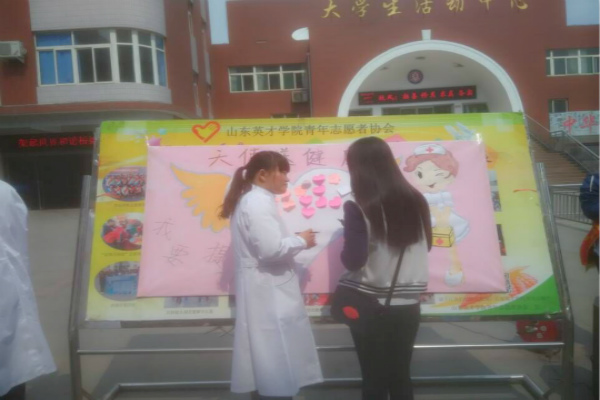 在初春之际,风伴随着阳光慢慢吹拂,等待已久的“天使送健康”活动在此时此刻揭开了她迷蒙的面纱,在阳光下挥洒着她的关怀与温暖,充溢着每一位学子感恩感动的心。山东英才学院青年志愿者协会于2015年3月26日在大学生活动中心前面开展了“天使送健康”活动,秉承着天使温柔而隐藏地挥洒爱与关怀的特点,在负责人的带领下,志愿者在活动中扮演一只天使,去默默地关爱另一只散落在人群中的属于他自己的另一只天使,去关心他人的健康,给他人送去健康,去体验爱别人的感觉。