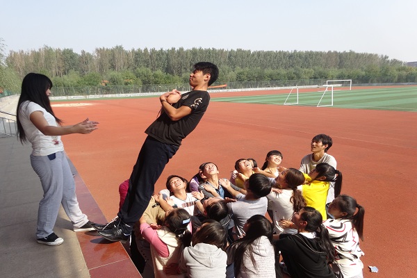 早上7:00所有志愿者在操场集合完毕,由会长宣布内训开始。首先,所有志愿者分成了两队,在操场跑了两圈做了准备活动。然后,志愿者分成了五个小队,开始玩“老鹰捉小鸡”的游戏。大家在操场上嬉戏玩耍,感觉又回到了童真的时代。在这个游戏的过程中,大家都积极的跑着、玩着,相互配合,为了胜利坚持不懈。接下来的游戏叫“信任背摔”。五个小队有的人在下面接着,上面的人开始做准备。本次活动虽然危险性很大,有的人不敢做,但是大家都没有退缩,一次次的尝试着,战胜着自己内心的恐惧。