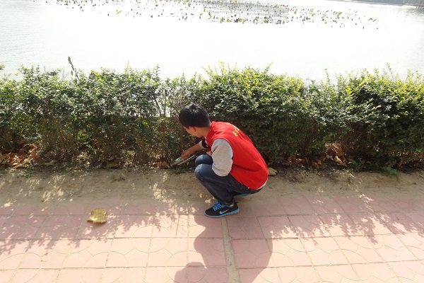 中午十二点整,由活动部负责人杨恒东带队,六个人穿戴整齐,开始值勤。首先,值勤路线从大学生活动中心由南往北进行。因为十二点是饭点时间,路上过往的同学较少,不文明现象鲜有出现。随后,志愿者值勤小队来到易湖旁,发现垃圾逐渐多了起来。值勤小队边巡查边捡垃圾,易湖旁在志愿者的清理下顿时变得亮丽了许多。接下来,志愿者值勤小队在宿舍楼下,餐厅周围发现不少垃圾,可见,随手扔垃圾是目前比较严重的不文明现象。下午一点钟,志愿者值勤小队清扫完垃圾,结束了中午时段值勤。