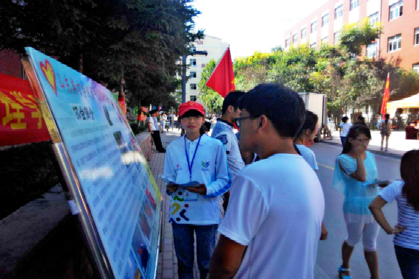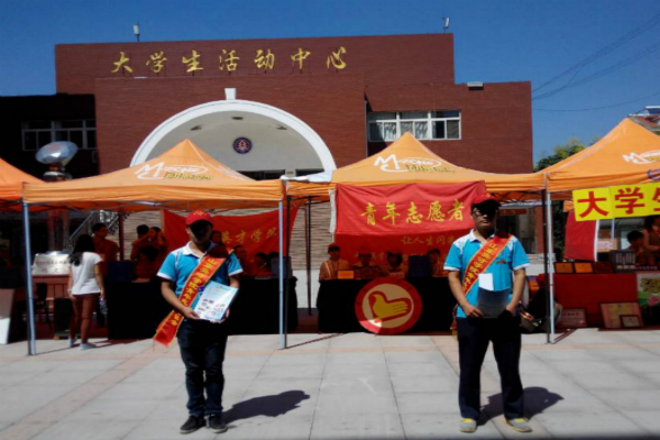 2014年9月4日早上八点整,青年志愿者协会招募人员在办公室集合完毕。在三位负责人刘月双、李建川、王海冰的带领下准时来到招募点大学生活动中心和大学生创业中心开始招募。