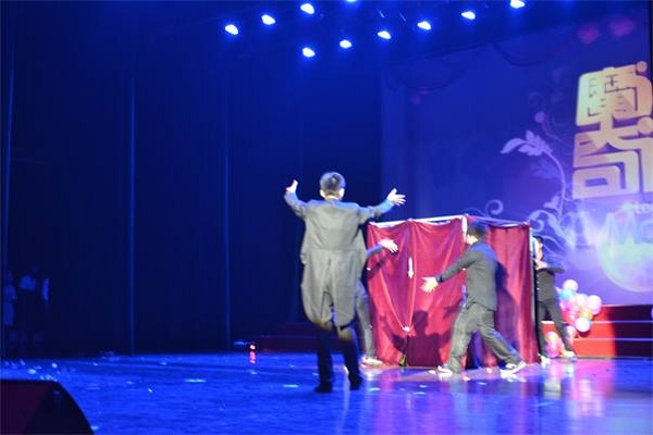 由各个学生组织干部精心编排的开场舞《小苹果》,拉开了晚会的序幕。他们夸张的动作,滑稽的表情,伴着朗朗上口的音乐,博得了大一新生的阵阵喝彩,晚会现场一下子热闹起来。随后,靓丽端庄的主持人闪亮登场,宣布晚会正式开始。晚会歌曲《为你而活》,以高亢的旋律,嘹亮的歌声,点燃了现场新生的情绪,晚会达到了一次高潮。紧接着奇幻的魔术绚丽登场,魔术师一次次的神奇表演,让晚会现场充斥着神秘的气氛。随后,富有冲击力的“低电量乐队”登场了,他们急促的电吉他旋律,富有节奏的鼓点,一下子点燃了现场所有人的激情,晚会达到了又一次高潮。
