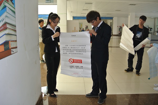 为营造美好和谐校园环境,打造文明校园,为响应校团委号召,青年志愿者协会于2014年4月16日上午在图书馆西门设置了纠正校园不文明行为的监督小组。