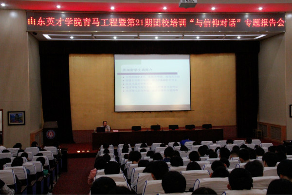 为进一步深化我校团员青年思想引领工作,切实推进我校青年马克思主义者培养工程,2014年5月5日,校团委组织举办了第21期青马工程培训班“与信仰对话”的主题报告会,参与本次活动有校各阶老师和学生。