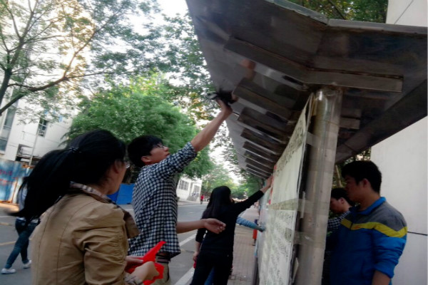 志愿者各自持好抹布、水桶、报纸等清理工具开始打扫。面对卫生死角,志愿者仔细、认真的清扫。对于宣传栏上多年累积下来的废旧广告宣传单,由于没有刀具,他们用手去撕扯或者用砖头、石头去刮。对于清理宣传栏掉落的垃圾,志愿者认真地做了善后工作。他们相互协作、各自分工,很快就清理完毕。