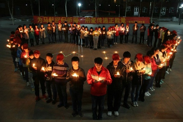 晚上六点三十分,志愿者们集合完毕,开始为马航祈福做准备。首先,志愿者们依次排队站列,在会长李晓林和部长们统一调度下,志愿者们在大活广场上摆出了“心”形,“心”中间是由荧光棒组成的“MH”。准备完毕,七点正式开始。志愿者们双手捧着红色的蜡烛,低头,为马航同胞默默祈祷。那双手上摇曳的红色的烛光,那一双双温柔真诚的眼睛,相互交融,化成了一颗炽热的心,为远在千里的马航同胞送去了英才学院莘莘学子的祝福。